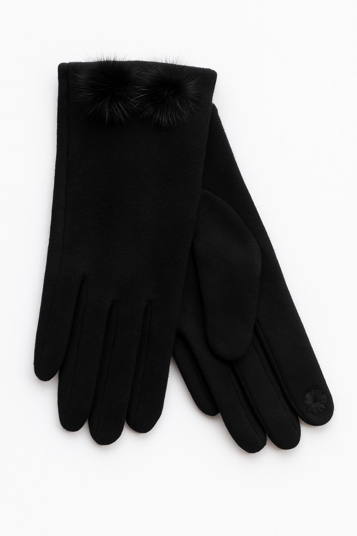 Μαύρα γάντια με τρία διακοσμητικά pon pon στον καρπό. Το επάνω μέρος του δείκτη είναι από υλικό συμβατό με οθόνη αφής.