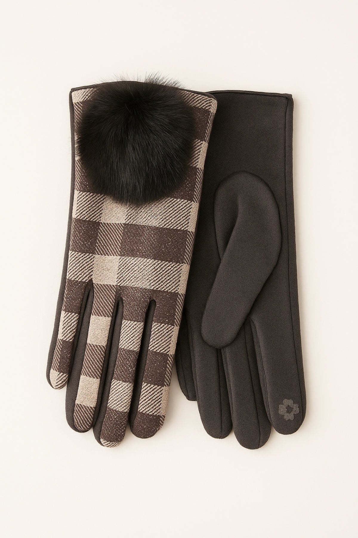 Κομψά γάντια με καρό σχέδιο στο πάνω μέρος, διακοσμημένο με διακριτική χρυσοκλωστή που χαρίζει λάμψη και πολυτέλεια. Στο κάτω μέρος διαθέτουν μαλακό σουέντ σε σκούρη απόχρωση και μία εντυπωσιακή φούντα σε μαύρο χρώμα. Στη βάση υπάρχει διακριτικό κέντημα λουλουδιού. Ζεστά, εκλεπτυσμένα και ιδανικά για σικ χειμερινές εμφανίσεις.