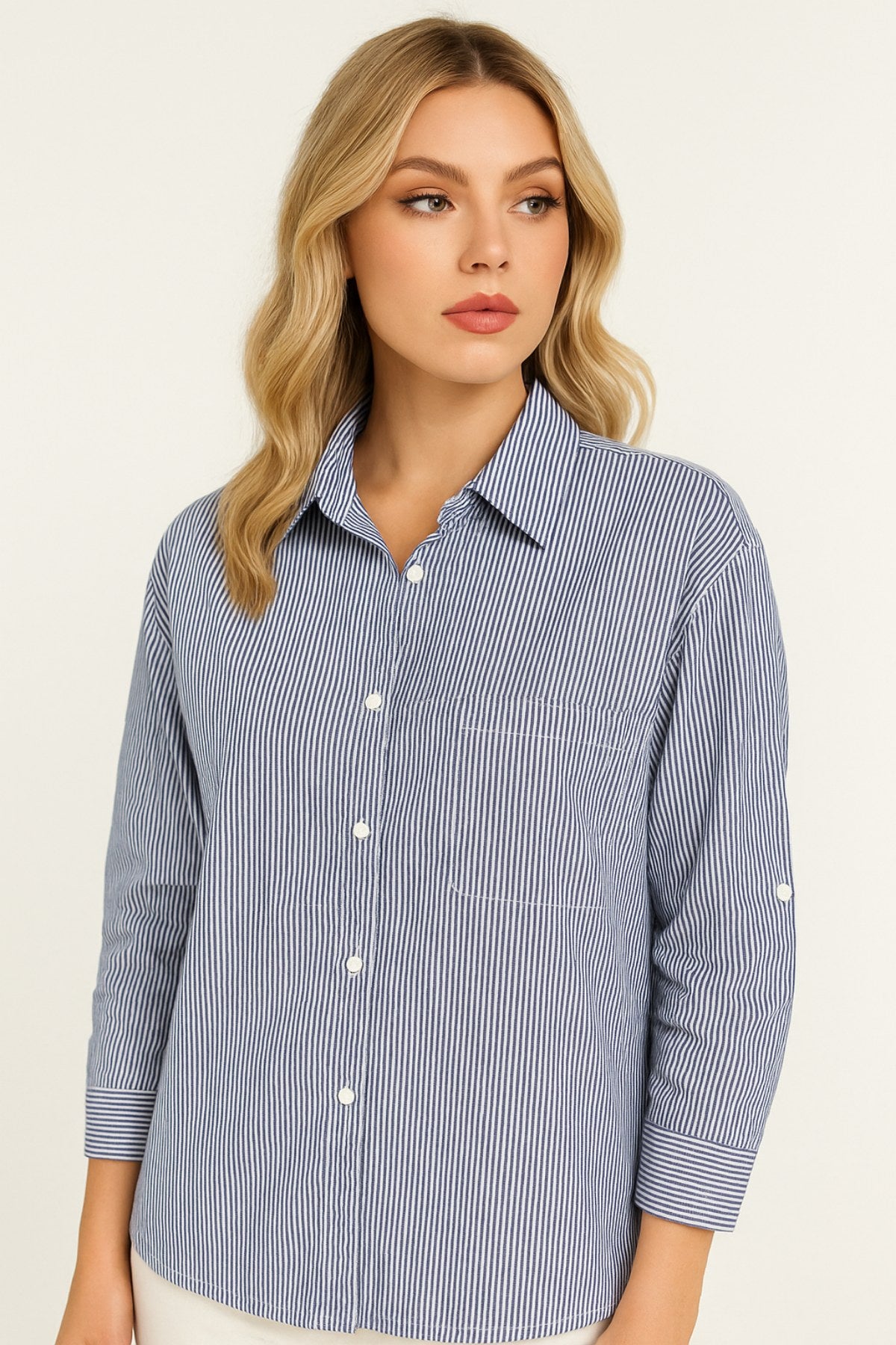 Κλασικό και διαχρονικό ριγέ πουκάμισο σε μπλε-λευκό συνδυασμό, ιδανικό για casual αλλά και πιο κομψές εμφανίσεις. Διαθέτει γιακά, μακρύ μανίκι με κουμπί για προσαρμογή και τσέπη στο στήθος. Το ανάλαφρο ύφασμα χαρίζει άνεση και δροσερή αίσθηση, καθιστώντας το απαραίτητο κομμάτι για κάθε γκαρνταρόμπα.