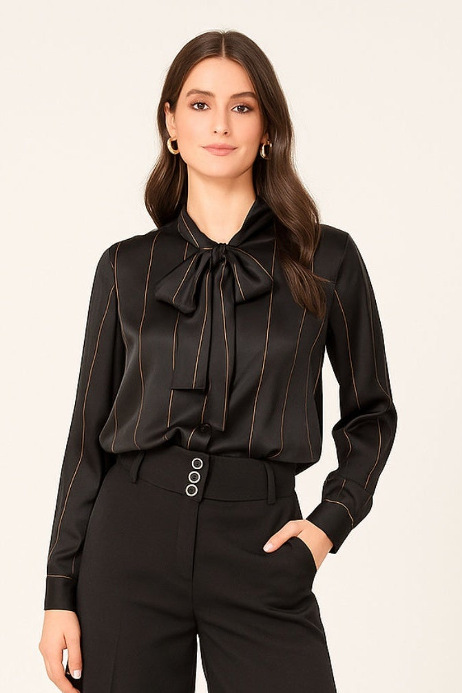 Πουκάμισο Σατέν με Δέσιμο στον Λαιμό & Διακριτικές Ρίγες Μαύρο