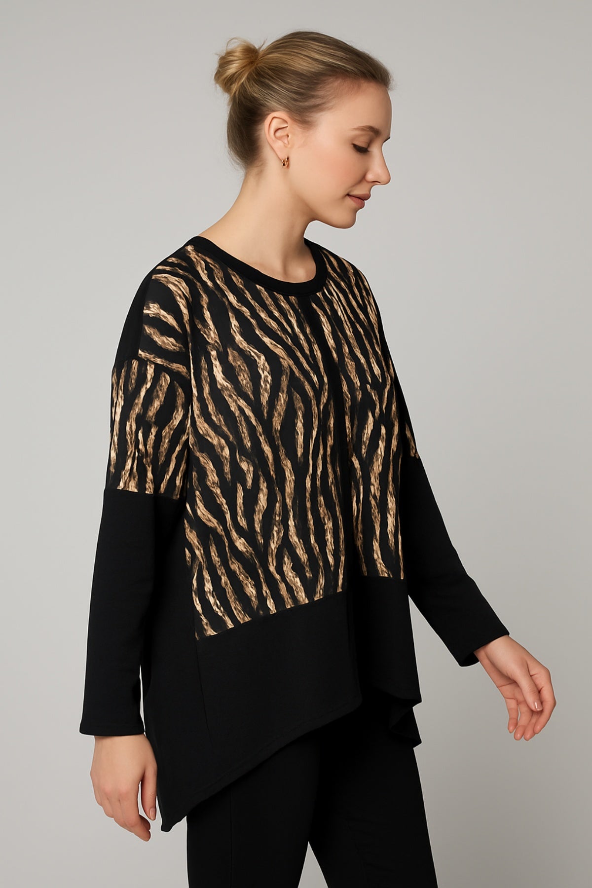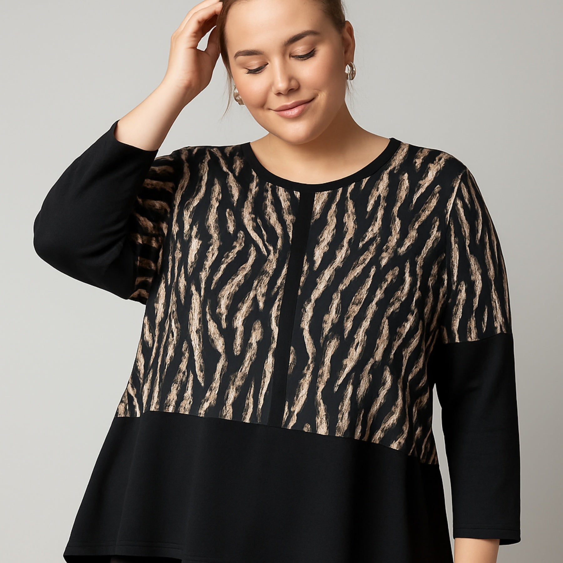 Κομψή και άνετη μπλούζα σε plus size γραμμή, με εντυπωσιακό animal print στο πάνω μέρος και μαύρη μονόχρωμη λεπτομέρεια στο κάτω μέρος. Το ελαφρύ ύφασμα και η άνετη εφαρμογή προσφέρουν καθημερινή άνεση, ενώ η περιφέρεια στήθους έως 150 εκ. την καθιστά ιδανική για όλα τα σώματα. Με μανίκια 3/4 και στρογγυλή λαιμόκοψη, αποτελεί τέλεια επιλογή για σικάτες αλλά και casual εμφανίσεις.