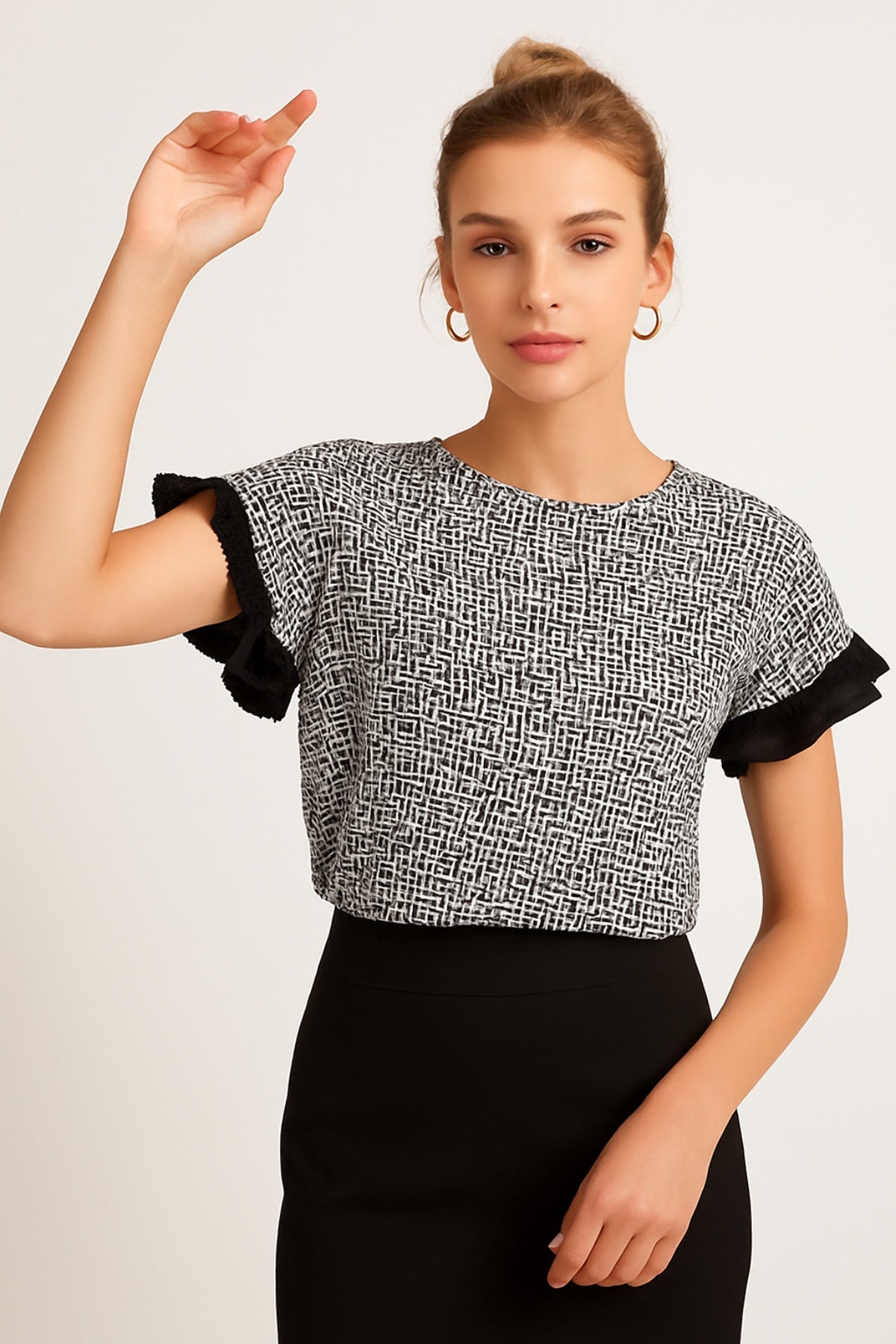 Κομψή μπλούζα από ζορζέτα με ιδιαίτερο ασπρόμαυρο μοτίβο, που ξεχωρίζει χάρη στις εντυπωσιακές λεπτομέρειες στα μανίκια. Τα κοντά μανίκια είναι από σατέν ύφασμα, διακοσμημένα με κεντητή μπορντούρα που χαρίζει πολυτελή και θηλυκή πινελιά. Το ελαφρύ ύφασμα προσφέρει άνεση και ροή, καθιστώντας τη μπλούζα ιδανική για office looks αλλά και βραδινές εξόδους.